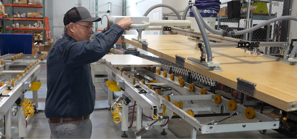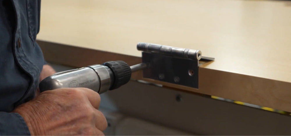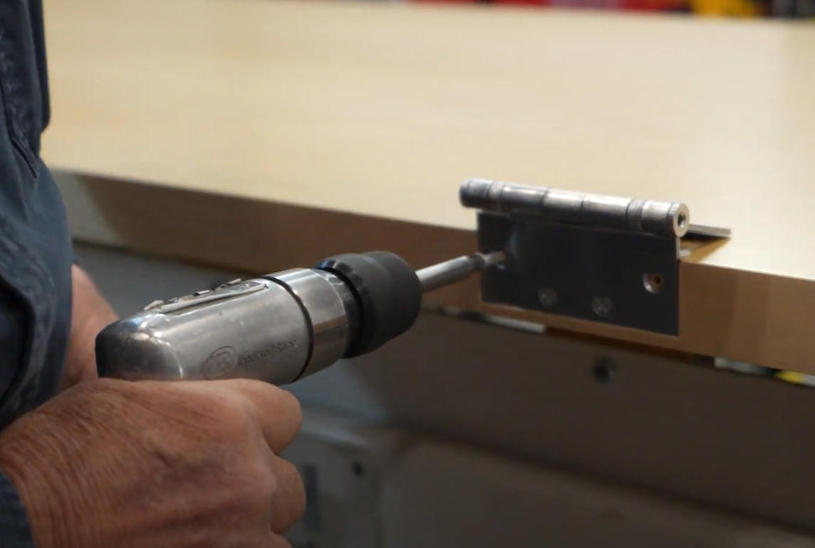 Doors are sent down our pre-install line where accessories are installed first on the door such as hinges and kickplates.
